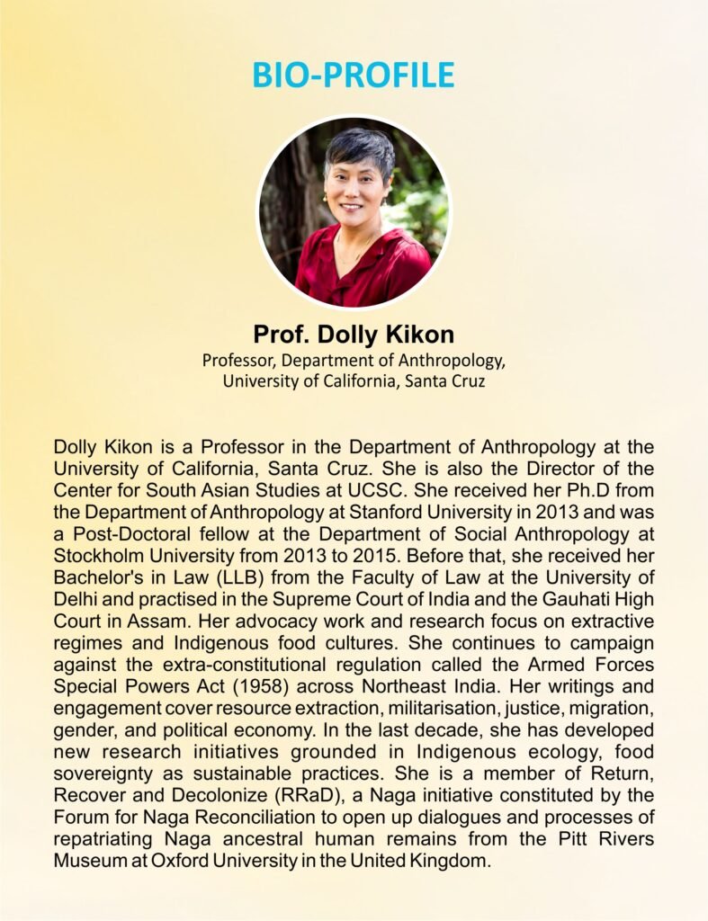 The resource person for the lecture will be Prof. Dolly Kikon, Professor, Department of Anthropology, University of California. Santa Cruz.