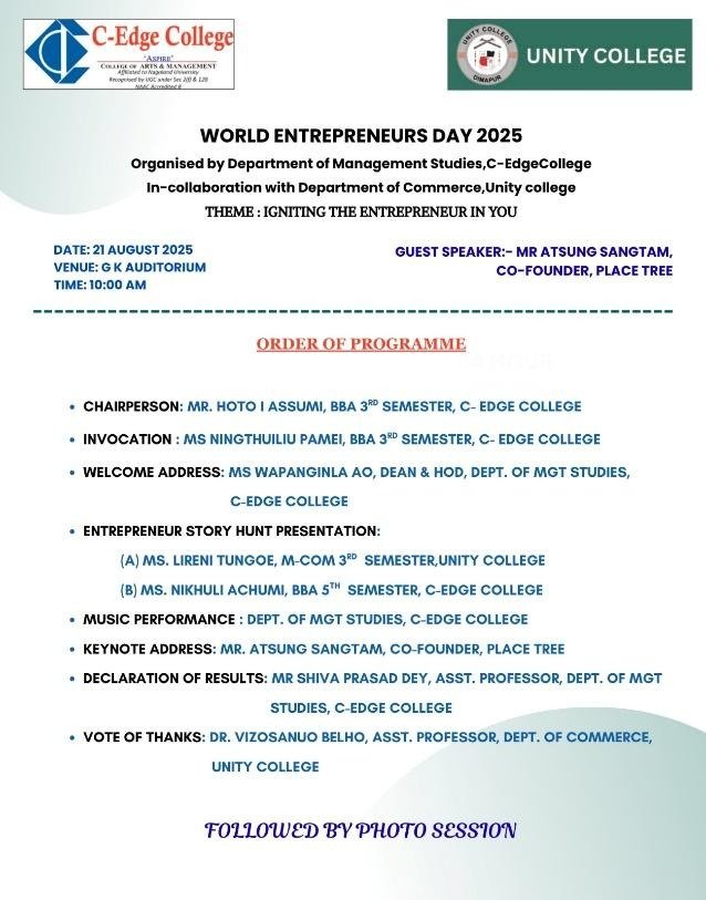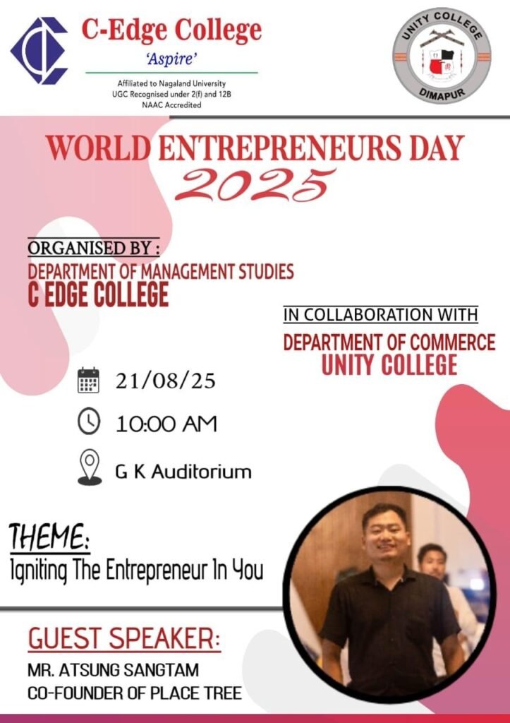 The Department of Commerce, Unity College in collaboration with the Department of Management Studies, C-Edge College observed The World Entrepreneurs Day 2025 on August 21, 2025 at C-Edge College. The theme of the event was “IGNITING THE ENTREPRENEUR IN YOU.” The guest speaker for the event was Mr. Atsung Sangtam, co-founder of Place Tree. Participants from both the colleges presented on “Entrepreneur Story Hunt”.