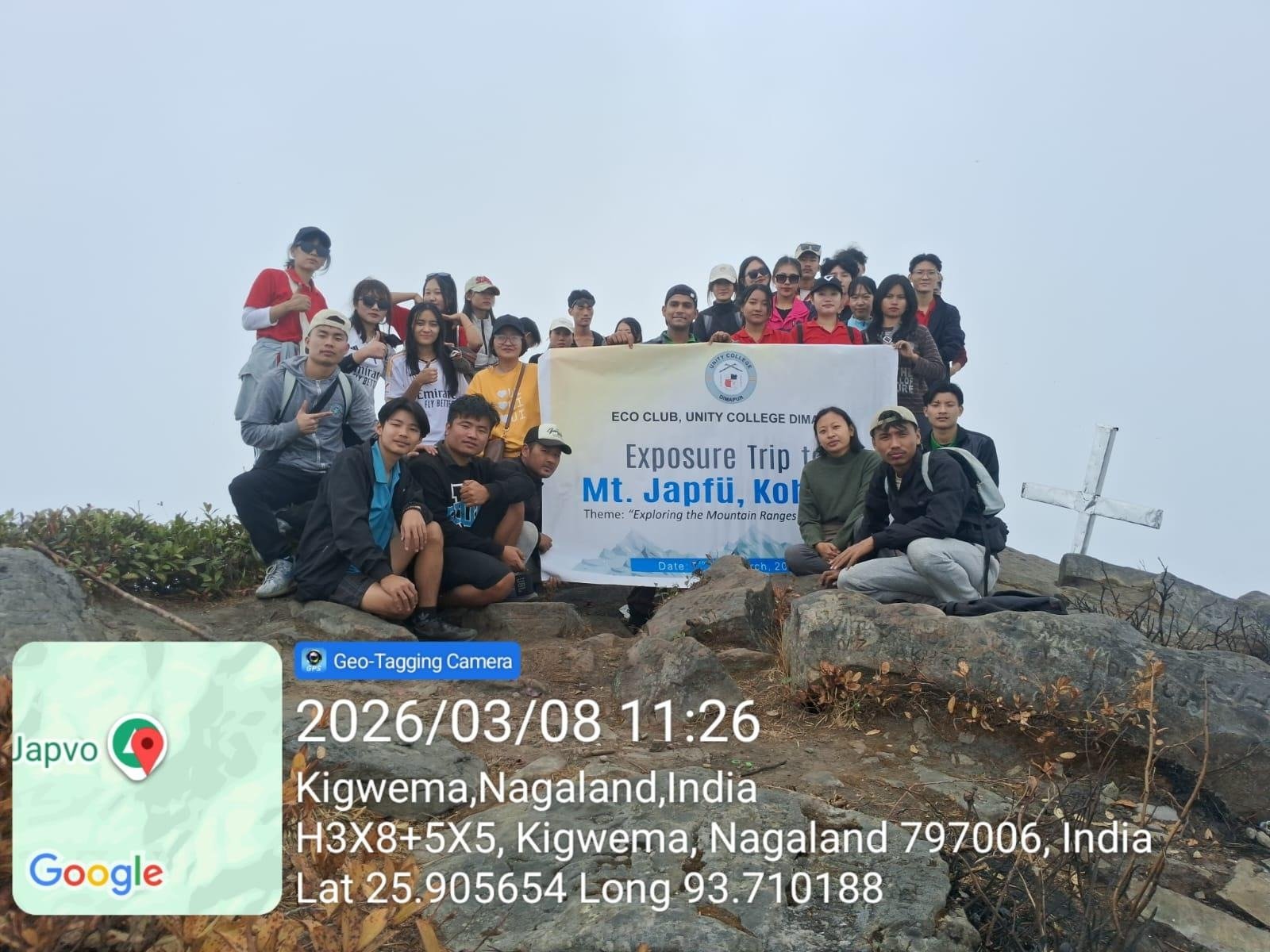 Eco Club, Unity College under the theme “Exploring the Mountain Ranges of Nagaland” took 28 members for camping and exploring the mountain ecosystems of Puliebadze and Mt. Japfϋ from 7th to 8th March 2026. This trip helps students connect with our culture and encourage conservation of mountain ecosystems. On 7th March, the students explored the “Puliebadze Wildlife Sanctuary” in Jotsoma village, set up a sign board and donated two aluminium waste bins to encourage conservation and avoid littering. On 8th March, the students took up a trekking journey from Jotsoma village to Mt. Japfϋ, to observe the community conserved forest and the mountain ecosystems.